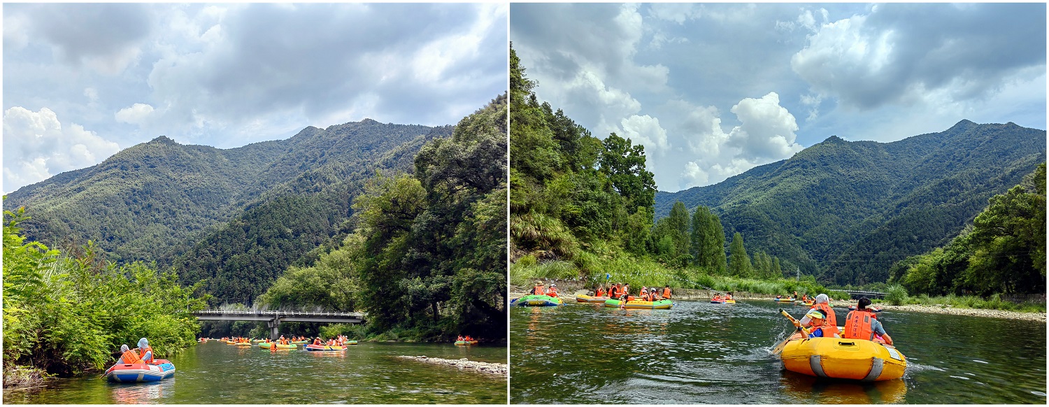 此次行程兩天一夜,在導(dǎo)游的帶領(lǐng)之下,我們首先來(lái)到石臺(tái)縣大演鄉(xiāng)剡溪村的西黃山漂流景區(qū)。下榻之時(shí),正值正午時(shí)分,景點(diǎn)兩岸青山疊嶂、風(fēng)光旖旎、草木蔥蘢、景色怡人。協(xié)普家人們換好服裝,穿上救生衣,在工作人員的協(xié)助之下,或一家?guī)卓凇⒒蛉搴糜呀Y(jié)伴乘筏而行、泛舟漂流,水面波光瀲滟、河底各式各樣的鵝卵石靜靜地躺著,日復(fù)一日被溪水沖刷,變得光滑又圓潤(rùn),坐在游筏里俯身去看,“瞧,有不少小魚(yú)正悠閑地在它的身上游過(guò)呢”,其水之清澈由此可見(jiàn)一斑。此次漂流全程3公里,在漂流過(guò)程中,除了欣賞到秀美的湖光山色,體驗(yàn)到劈波斬浪的沖刺暢快感,更讓人愜意的是,在河灘淺水區(qū)域漂流回緩,協(xié)普家人們正帶著孩子們,在這悠閑的時(shí)光里愉快的打起了水仗,孩子們帶上了自己心愛(ài)的水槍玩起了水槍大戰(zhàn),有人帶來(lái)了水盆和水瓢,于是乎水槍大戰(zhàn)現(xiàn)場(chǎng)演變成了潑水節(jié),歡笑聲、尖叫聲蕩漾在山谷之間,在這愜意的時(shí)光里,平日的壓力和煩擾仿佛已煙消云散。