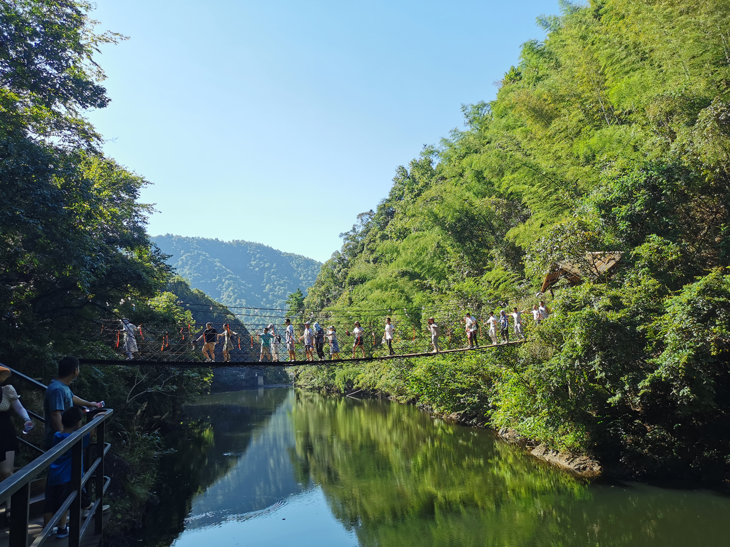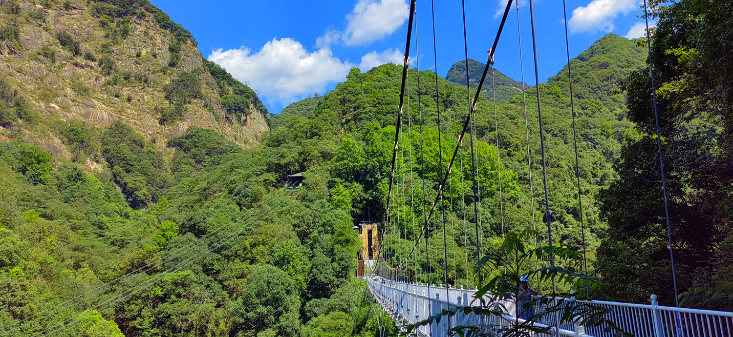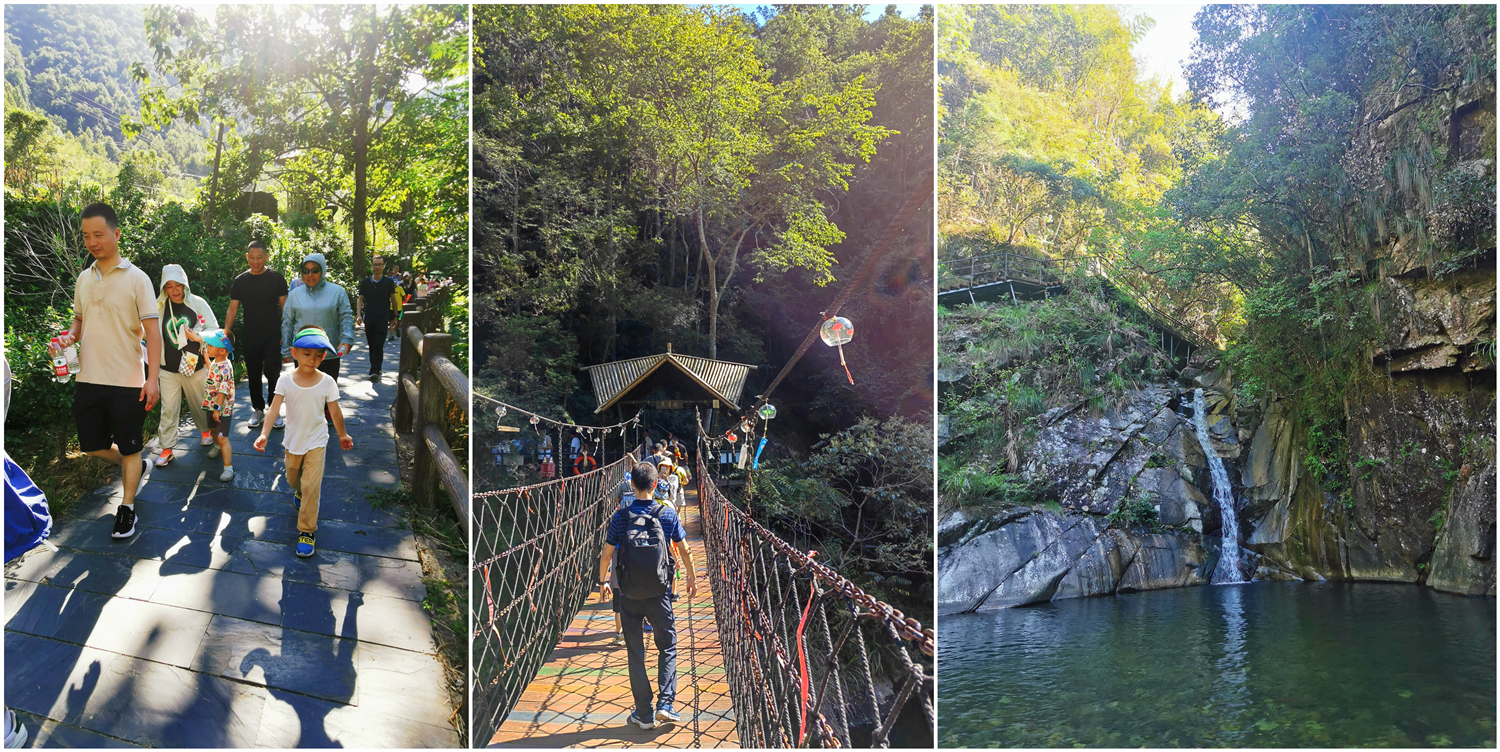 晚上體驗(yàn)了農(nóng)家樂(lè)菜肴和當(dāng)?shù)靥厣袼藓螅诙煸缭绲钠鸫?,吃完早餐集合,大家興致勃勃地乘著大巴來(lái)到了醉山野景區(qū),這里是安徽省內(nèi)第一個(gè)5D玻璃橋皖南地區(qū)最大的瀑布群。在進(jìn)入景區(qū)之前,有一段鄉(xiāng)村道路,徒步的過(guò)程頂著早上八九點(diǎn)的太陽(yáng)就覺(jué)得酷暑難耐,然而當(dāng)我們正式踏入景點(diǎn),走在山谷間的步棧道上,遠(yuǎn)處是蔥郁的山林、近處是流動(dòng)的溪水、頂上是一片陰涼,只聽(tīng)見(jiàn)大朋友們小朋友們都在說(shuō)“好涼快啊,好涼快??!”沿著步棧道繼續(xù)前行,來(lái)到了千花橋,這里是著名的網(wǎng)紅打卡點(diǎn),小朋友們都絡(luò)繹不絕的脫下鞋子、挽起褲腳,下水嬉戲游玩。有合影拍照的、有撿起小石片仍水花的、還有在石頭縫里抓螃蟹的。大家坐在陰涼的石頭塊上休憩閑聊,甚至玩笑起來(lái),富硒山水、天然氧吧,以后老了退隱山林一定要來(lái)這里休養(yǎng)生息。有人不被沿途風(fēng)景耽誤過(guò)久,繼續(xù)往山上攀爬,他們到了山頂穿過(guò)了玻璃棧橋,體驗(yàn)了“一覽眾山小”的視野和格局。由于兩個(gè)月沒(méi)有下雨,雖有山谷溪流卻看不到震撼的黃崖瀑布群,實(shí)屬遺憾,卻也給大家下次再來(lái)此一游留下了機(jī)會(huì)。