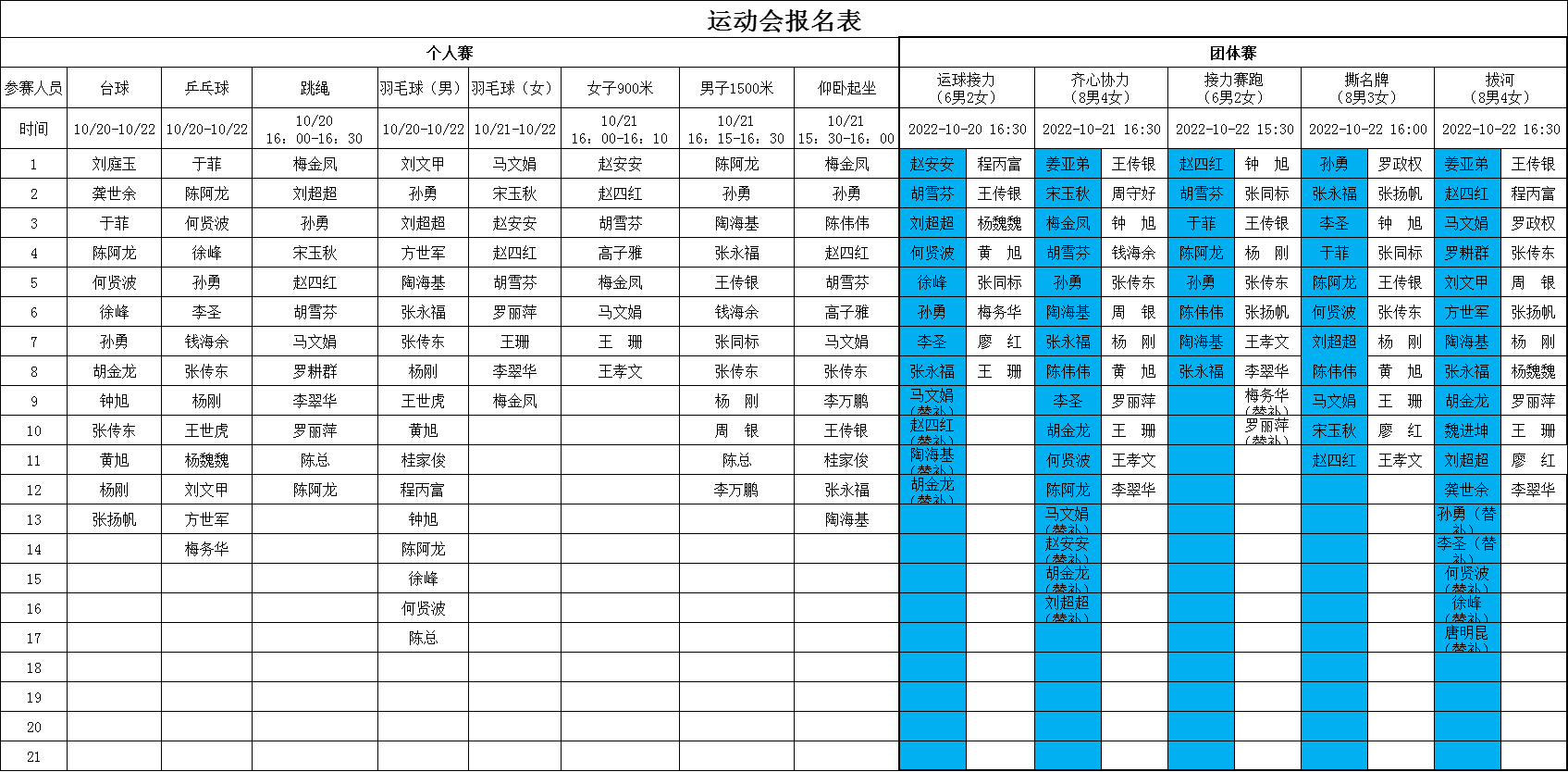 金秋送爽、丹桂飄香,在這秋高氣爽的美好時節(jié),我們滿懷喜悅的心情迎來了公司2022年度秋季職工運動會。本屆運動會分個人賽、團體賽,自10月20日至22日共持續(xù)3個下午,比賽項目包括乒乓球、羽毛器(男子、女子單項)、臺球、跳繩、仰臥起坐、女子900米,男子1500米長跑8項個人賽,還有齊心協(xié)力、運球接力、女子接力賽、男子接力賽、撕名牌、拔河共6項團體賽。在歷屆運動會的賽程、賽項上都增加了新的活動亮點,從參賽名單上不難看出,全體協(xié)普家人的熱情和參與度都異常高漲。